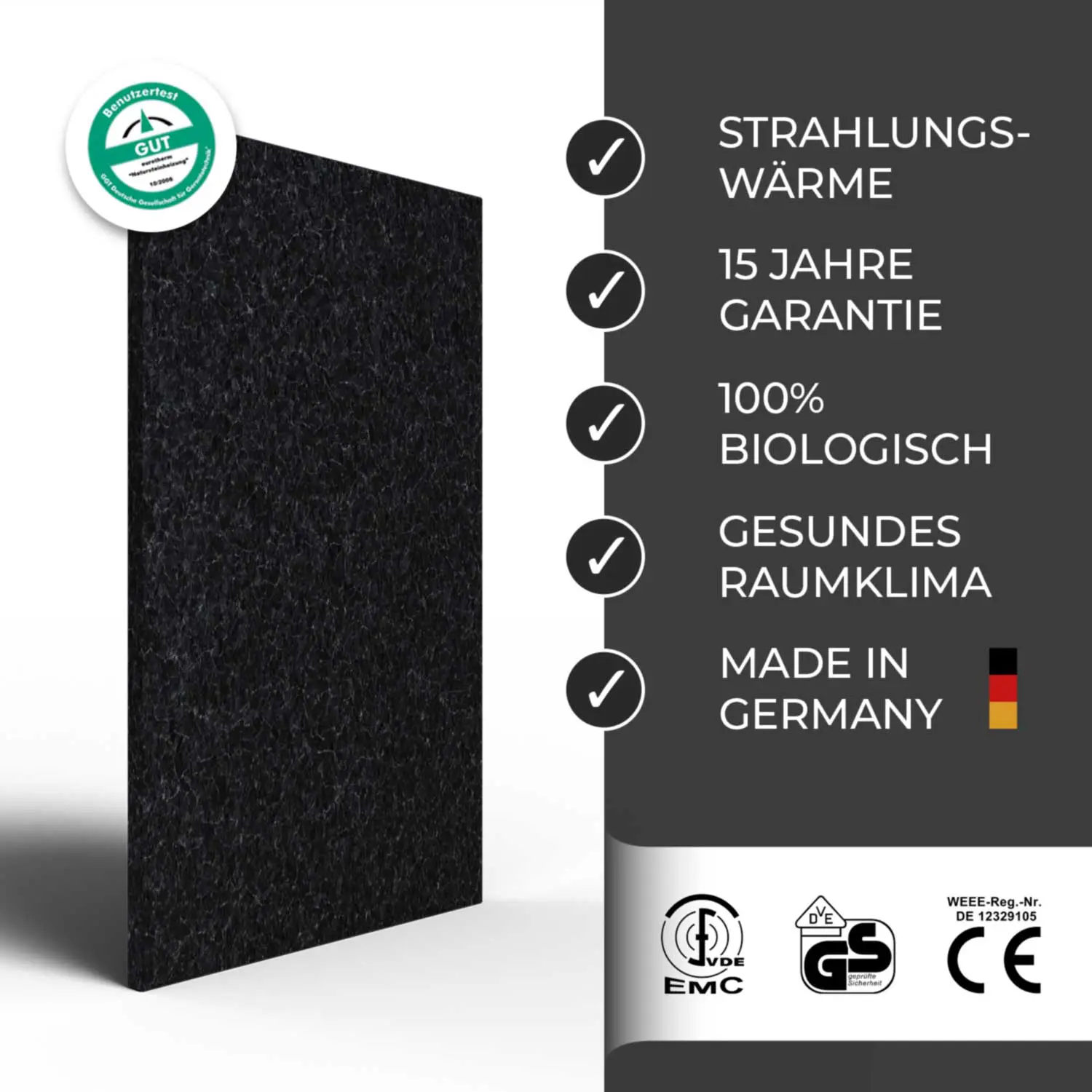 Setzen Sie auf natürliche Eleganz und innovative Technik mit Angola Black und genießen Sie langlebige Qualität kombiniert mit moderner Heiztechnologie.