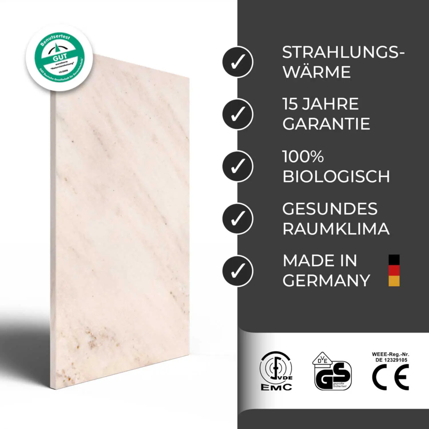 Schadstofffreie Wärmeabgabe besonders für Allergiker geeignet. Als vollwertiges Heizsystem oder als Zusatzheizung anwendbar. Herstellungsverfahren mit sehr hohem Strahlungswirkungsgrad und Teilspeicherwirkung. Nutzung von Sonderheiztarifen HT/NT, Zubehör: Rückstrahlplatte mit Alubeschichtung für Außenwände in Altbauten, Handtuchhalter, Thermostate. Spezielle Sondermaße sowie Sonderformen, Sandstrahlmotive auf der Heizung nach Anfrage erhältlich. Nach Terminvereinbarung kann Ware im Werk persönlich ausgesucht werden. Geringe Heizleiterbelastung garantiert eine sehr lange und wartungsfreie Gebrauchsdauer. 15 Jahre Garantie auf die Funktion der Heizelemente. Anforderungen nach EnEV und EEWärmeGesetz bzw. GEG können in Kombination mit anderen Haustechnikanlagen kostengünstig eingehalten werden.