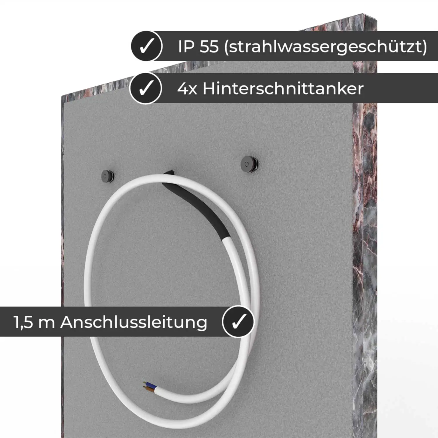 Schadstofffreie Wärmeabgabe besonders für Allergiker geeignet. Als vollwertiges Heizsystem oder als Zusatzheizung anwendbar. Herstellungsverfahren mit sehr hohem Strahlungswirkungsgrad und Teilspeicherwirkung. Nutzung von Sonderheiztarifen HT/NT, Zubehör: Rückstrahlplatte mit Alubeschichtung für Außenwände in Altbauten, Handtuchhalter, Thermostate. Spezielle Sondermaße sowie Sonderformen, Sandstrahlmotive auf der Heizung nach Anfrage erhältlich. Nach Terminvereinbarung kann Ware im Werk persönlich ausgesucht werden. Geringe Heizleiterbelastung garantiert eine sehr lange und wartungsfreie Gebrauchsdauer. 15 Jahre Garantie auf die Funktion der Heizelemente. Anforderungen nach EnEV und EEWärmeGesetz bzw. GEG können in Kombination mit anderen Haustechnikanlagen kostengünstig eingehalten werden.